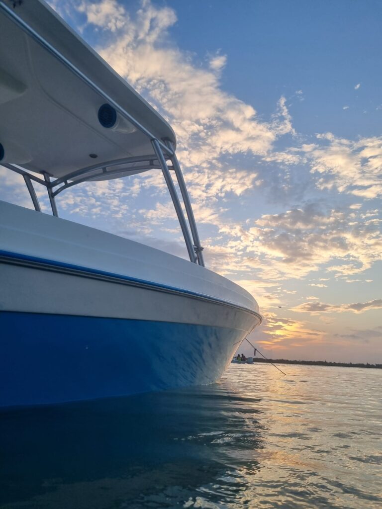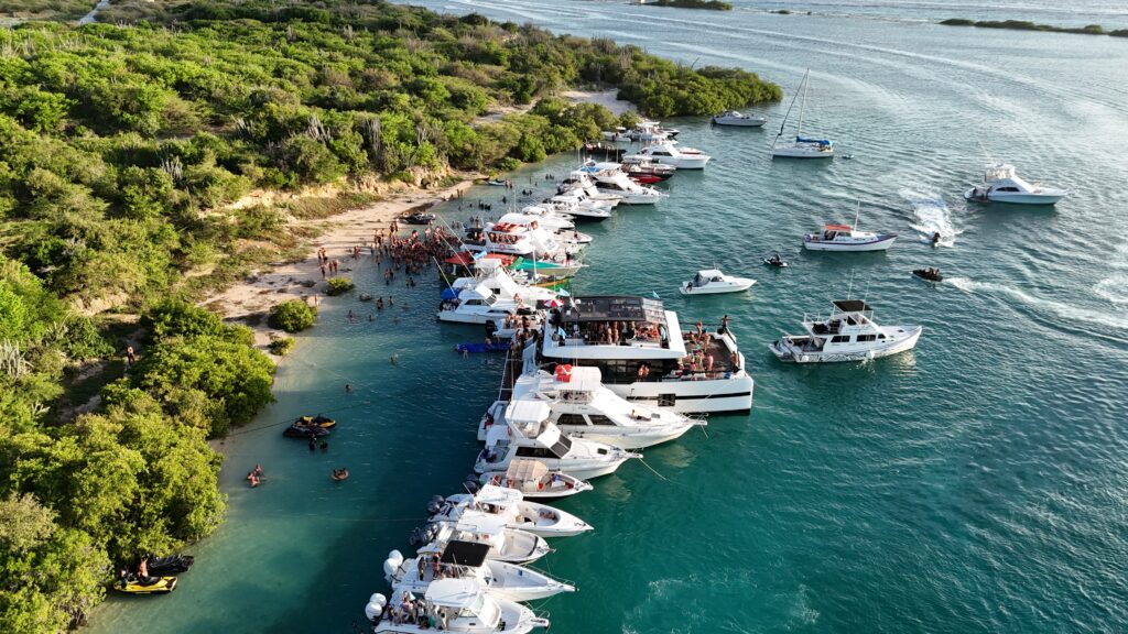 On Sundays the bay becomes famous for its lively boat gatherings where locals and visitors anchor their boats and enjoy music, drinks, and sunshine.